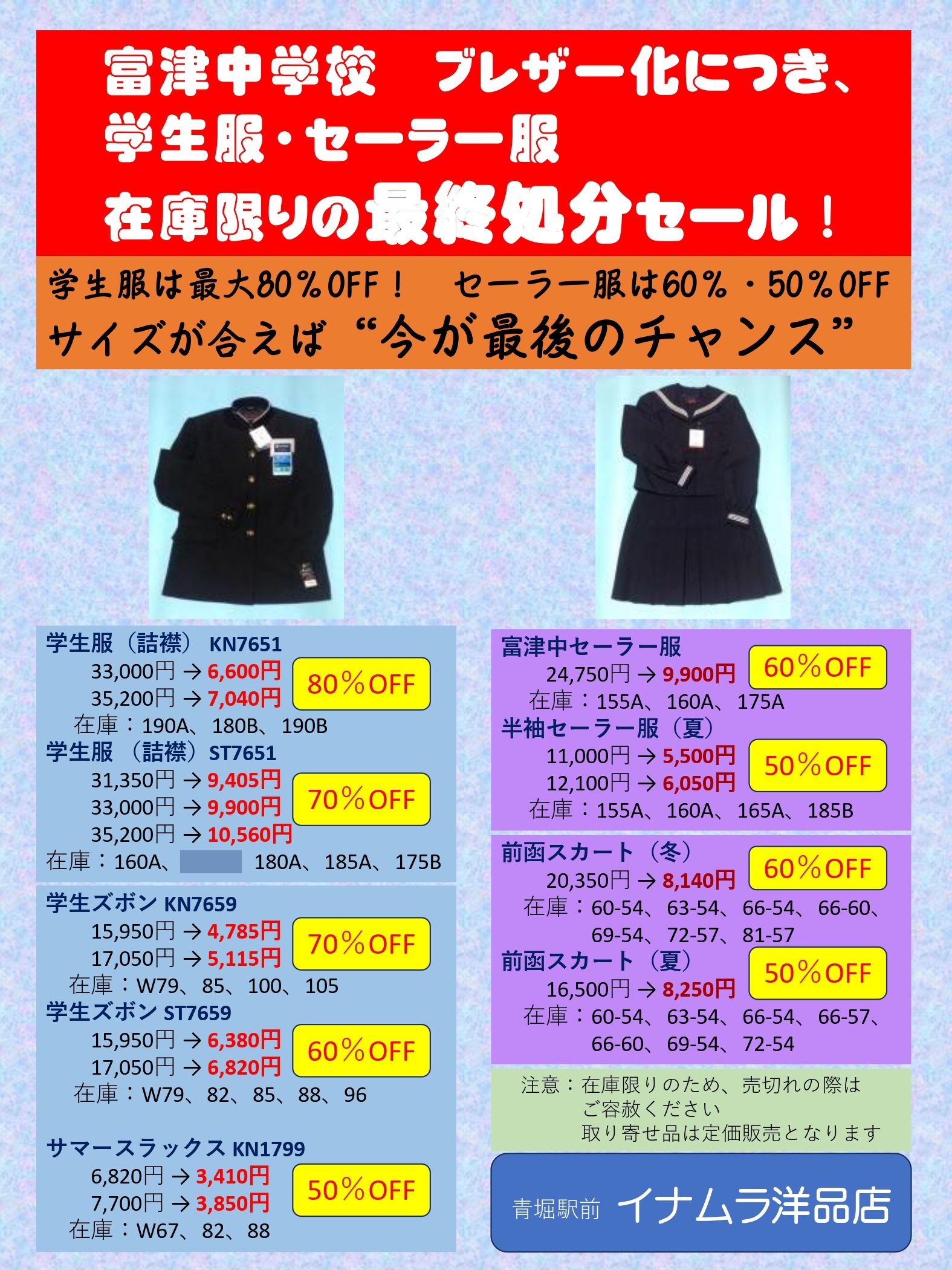 富津中学校のブレザー制服化に伴い、在庫としてある学生服・セーラー服を特価で処分致します。